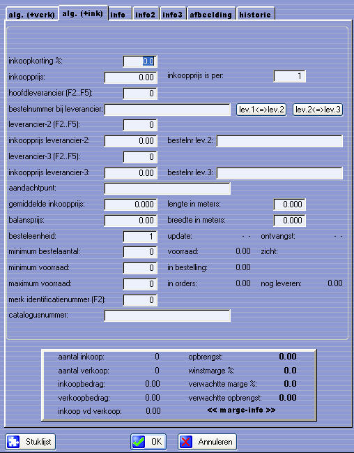 Verder ziet u bovenin nog een aantal tabbladen voor extra informatie, onder andere een aantal infovelden, een tabblad voor het vastleggen van een afbeelding en een historie tabblad, waar u alle verkopen van dit artikel direct kunt terugvinden.