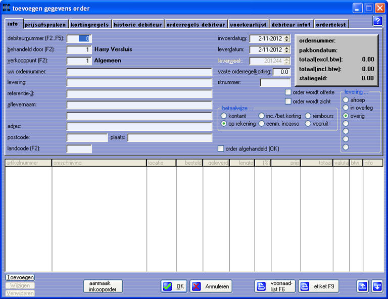 Wanneer u nu op [Toevoegen] links onderaan uw scherm klikt, zal het order invoerscherm worden geopend: