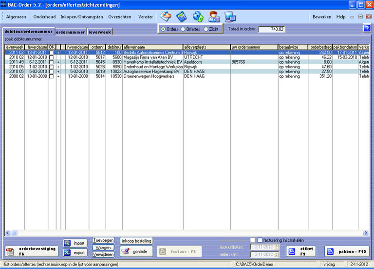Om een order in te voeren dient u allereerst het debiteurnummer in te voeren. U kunt de functietoetsen F2, F3, Shift F3, F4 of F5 gebruiken om een overzicht van debiteuren op te roepen en de door u gewenste debiteur te selecteren: Erop klikken en vervolgens op [Selecteer] klikken onderaan uw scherm. Hierna wordt dan automatisch alle debiteurinformatie in bovenstaand scherm ingevuld.