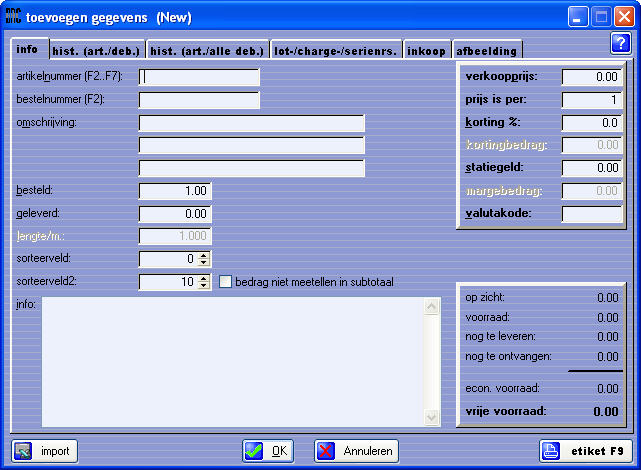 U kunt nu een artikelnummer invoeren. Met de toetsen F2, F3, Shift F3, F4 en F5 kunt u naar de artikeloverzichten en het gewenste artikel selecteren. Na deze selectie wordt de artikelinformatie automatisch ingevuld.